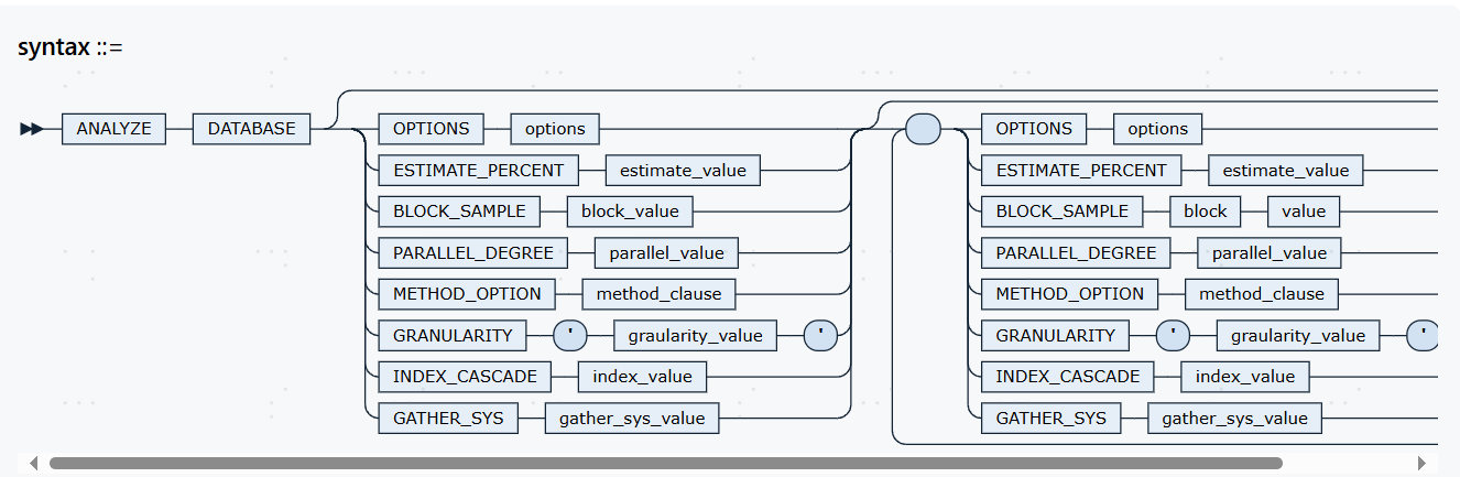 syntax::= ANALYZE DATABASE [(OPTIONS options|ESTIMATE_PERCENT estimate_value|BLOCK_SAMPLE block_value|PARALLEL_DEGREE parallel_value|METHOD_OPTION method_clause|GRANULARITY "'" graularity_value "'"|INDEX_CASCADE index_value|GATHER_SYS gather_sys_value)