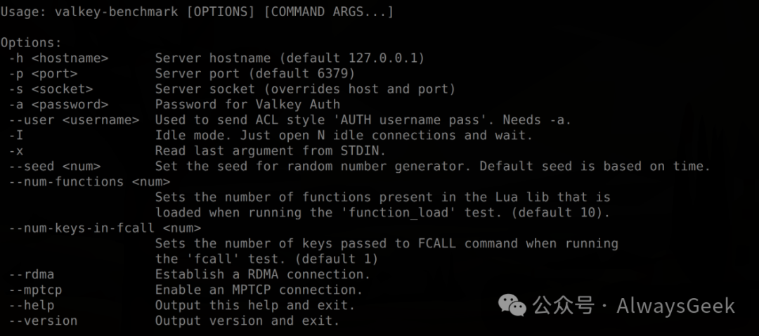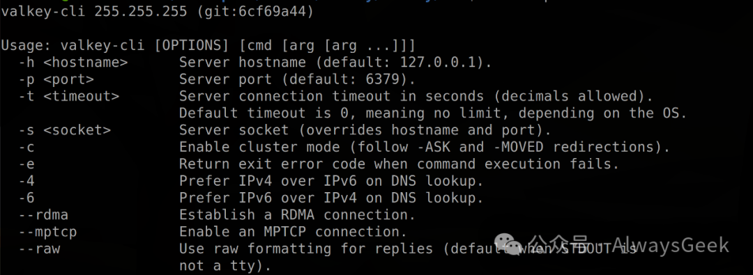 直到最近的2025-5-7,libvalkey发布0.1.0版本,正式代替hiredis合入到valkey中。libvalkey中已经支持了Valkey Over RDMA,因此仅需要少量改动,valkey-cli和valkey-benchmark即可支持RDMA。我(pizhenwei)向valkey上游为valkey-cli和valkey-benchmark增加了--rdma参数,这部分改动在2025-5-9合入上游。拉取最新的代码后,make BUILD_RDMA=yes即可使能Valkey Over RDMA,--help之后可以看到命令行工具增加了--rdma选项。