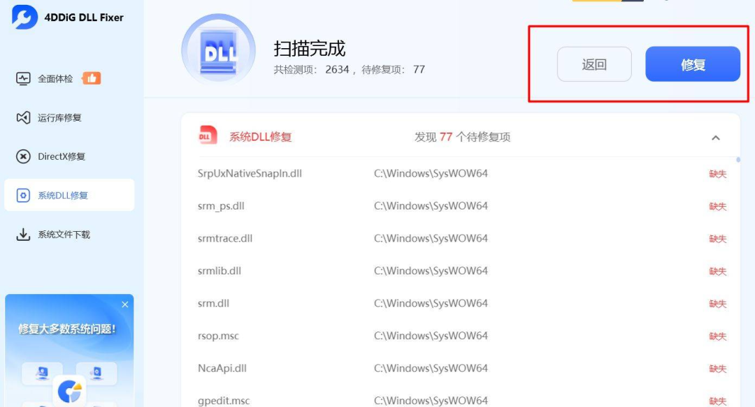 一键自动修复:扫描完成后,你只需要点一下 “修复” 按钮,软件就会自动从它的在线库下载或者替换对应的 DLL 文件,整个过程都是自动进行的,很适合不懂技术的小白使用。