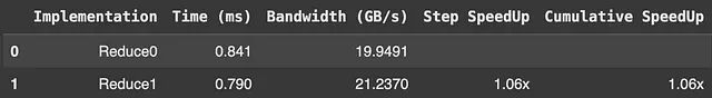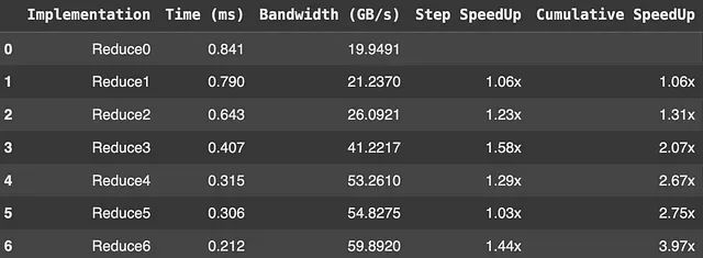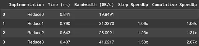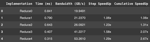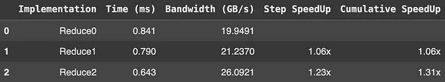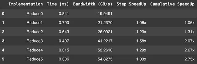 这种变化通过将内存访问模式与GPU对连续内存访问的偏好更紧密对齐,显著改善了内存访问效率。通过访问相邻的内存位置,REDUCE-2降低了缓存未命中和内存库冲突的概率,提升了内存带宽利用效率,并改善了归约操作的整体性能。