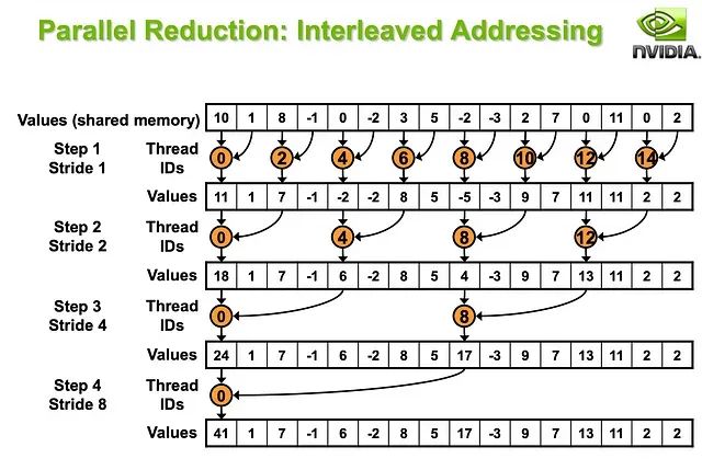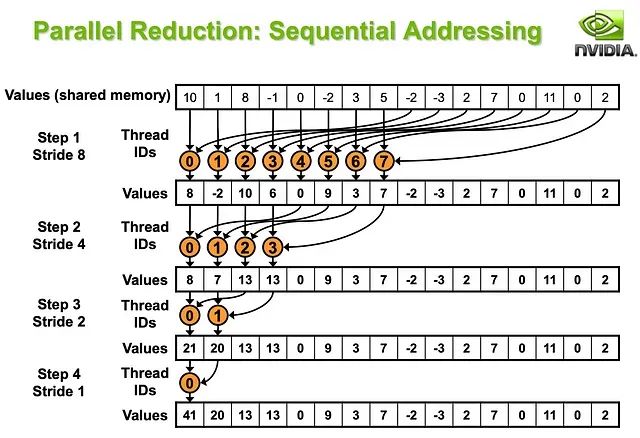 开始归约,每次迭代将步长减半。这意味着线程首先处理待求和数据间的最大间隙,快速减少需要处理的数据总量。基于线程ID的索引使每个线程使用其ID来访问连续的数据点对而非分散的数据点,简化了访问模式并最小化了内存延迟。随着步长的减小,线程组合相邻元素,优化了内存使用并提升了数据吞吐量。