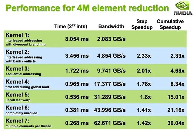 由于既不受带宽限制也不受计算限制,还存在第三个潜在瓶颈:指令开销。这包括GPU执行的所有辅助指令,这些指令不直接参与数据加载、存储或归约的主要算术操作。具体包括地址算术运算(计算下一个要加载的地址空间)和循环开销(处理循环逻辑、条件判断和迭代控制)。