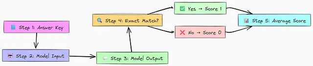 该评估流程的核心机制包括:建立标准答案作为预期响应的基准;向模型提供输入并获取基于该输入的输出;执行逐字符精确匹配检验,若匹配则赋值 1 分,不匹配则为 0 分;最后对所有样本的得分进行平均计算,得出模型的整体精确匹配性能指标。