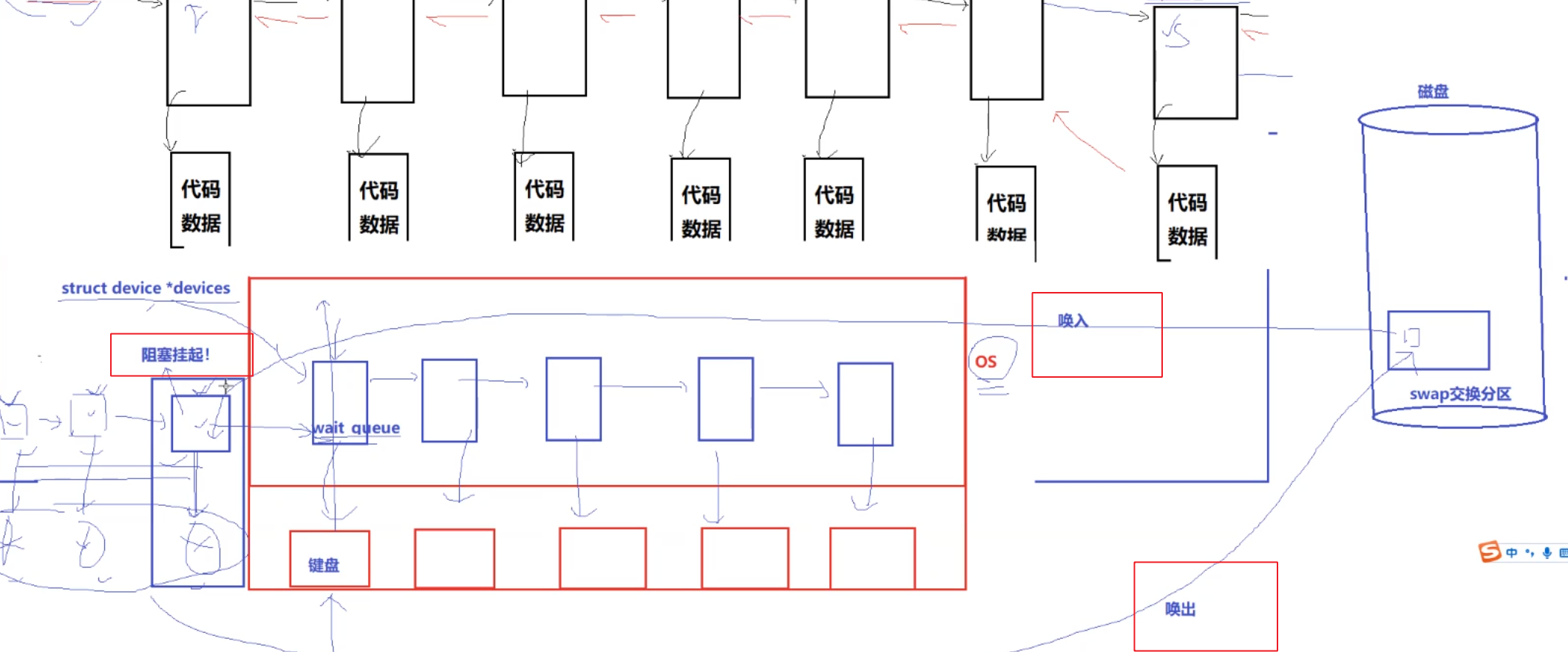 os内存严重不足的时候,不在运行的pcb的代码数据,也就是阻塞状态的时候,把该pcb的代码数据换入磁盘外设的交换区,这就叫做阻塞挂起 如果内存还是不足,也可能把运行队列末端的pcb代码数据换入,这就叫做运行挂起。