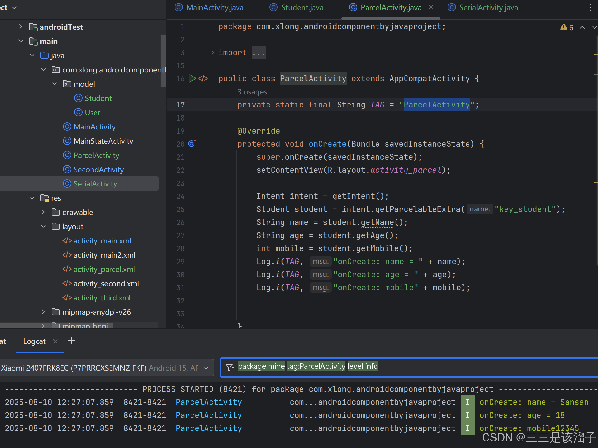 Student student = intent.getParcelableExtra("key_student");