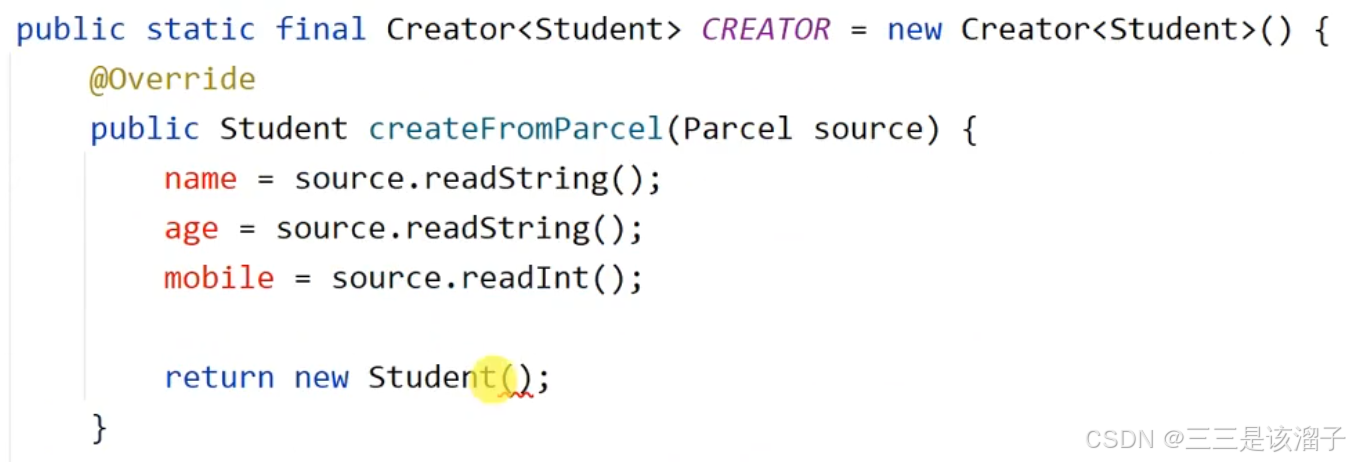 }public static final Creator<Student> CREATOR = new Creator<Student>() {