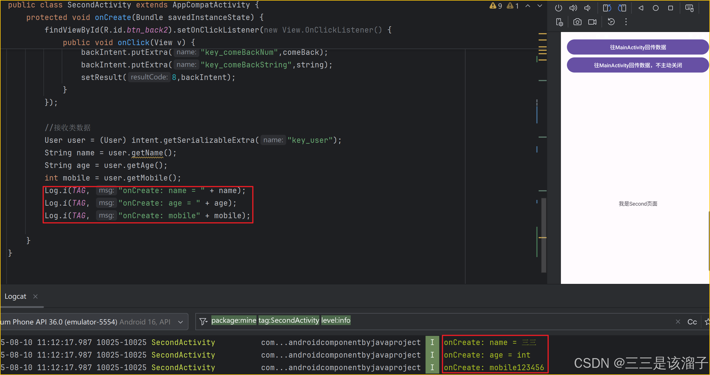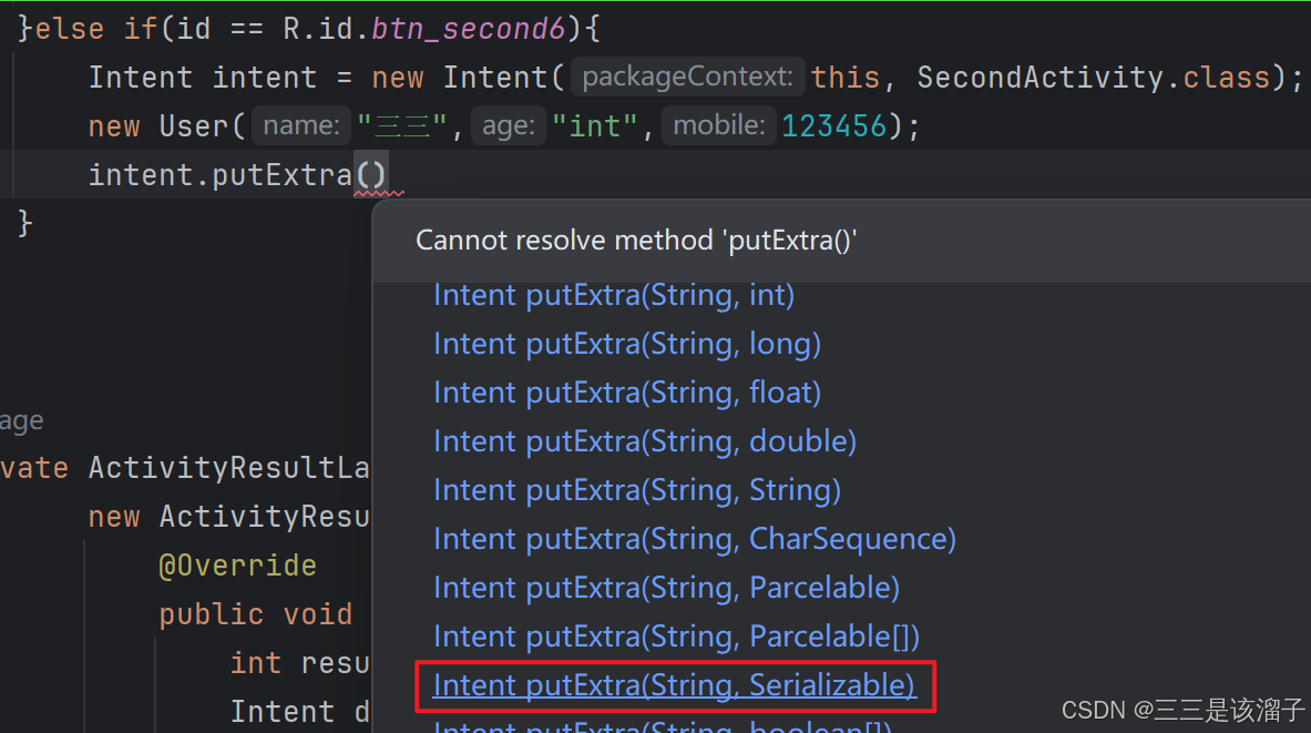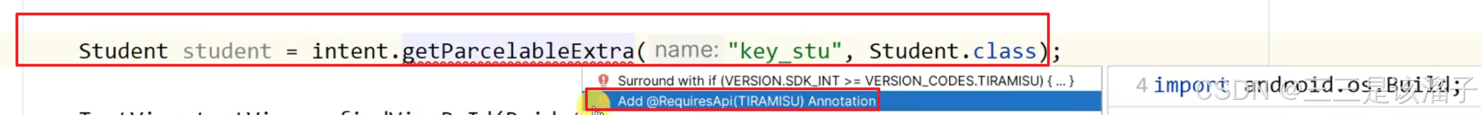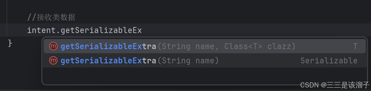 getSerializableExtra(String name, Class<T> clazz) :这是 Android API 29 引入的方法,它在获取数据的同时,通过传入目标类型的 Class 对象,直接返回指定类型的数据;比如这段代码