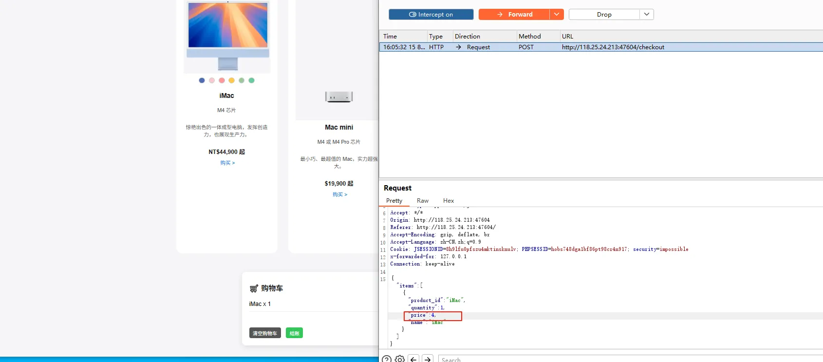 点击结账,并且获取数据包 修改请求包中的物品单价 图示修改为4元