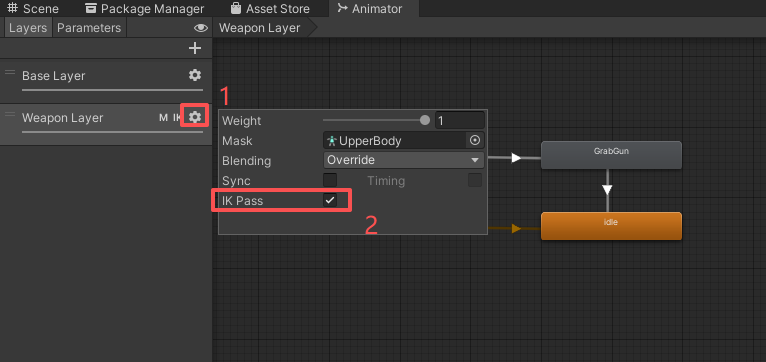 3.点击动画控制器,选中“Layers”页签,选择上身的动画图层(如果不清楚该动画怎么来的小伙伴,可以去查看我上一篇文章《【Unity3D实例-功能-拔枪】角色拔枪(二)分割上身和下身》),点击图层右上角的“小齿轮”,在弹出的窗口中,勾选上“IK Pass”。