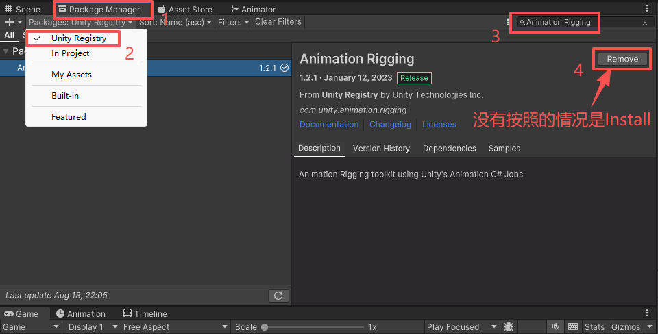 点击 Unity 的“Package Manger”下拉框,选择“Unity Registry”,然后在搜索框中输入“Animation Rigging”,再点击“Install”按钮进行安装即可。