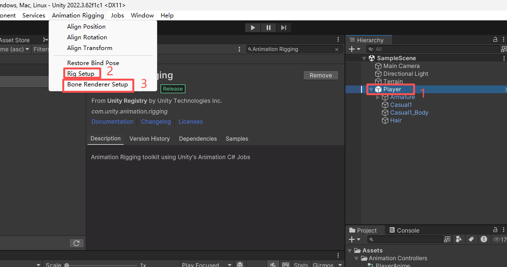 选中角色,点击菜单栏中的“Animation Rigging”,然后点击“Rig Setup”和“Bone Renderer Setup”,为角色添加骨络。