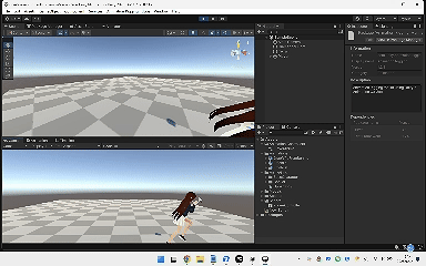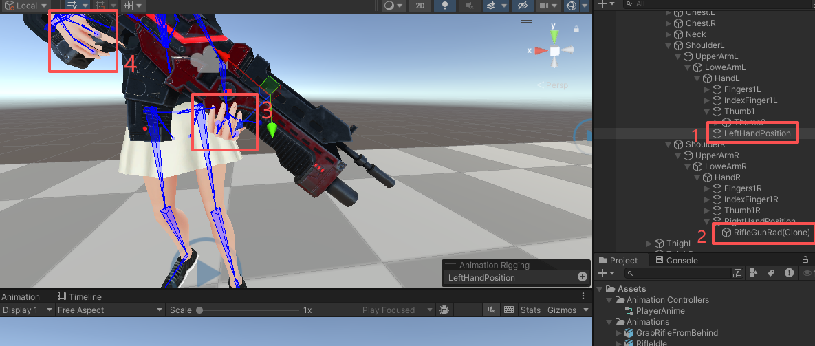 3.接着大家可以在运行状态下,拖拉角色左右手下的空物体,调整角色的手部来紧紧握住武器。