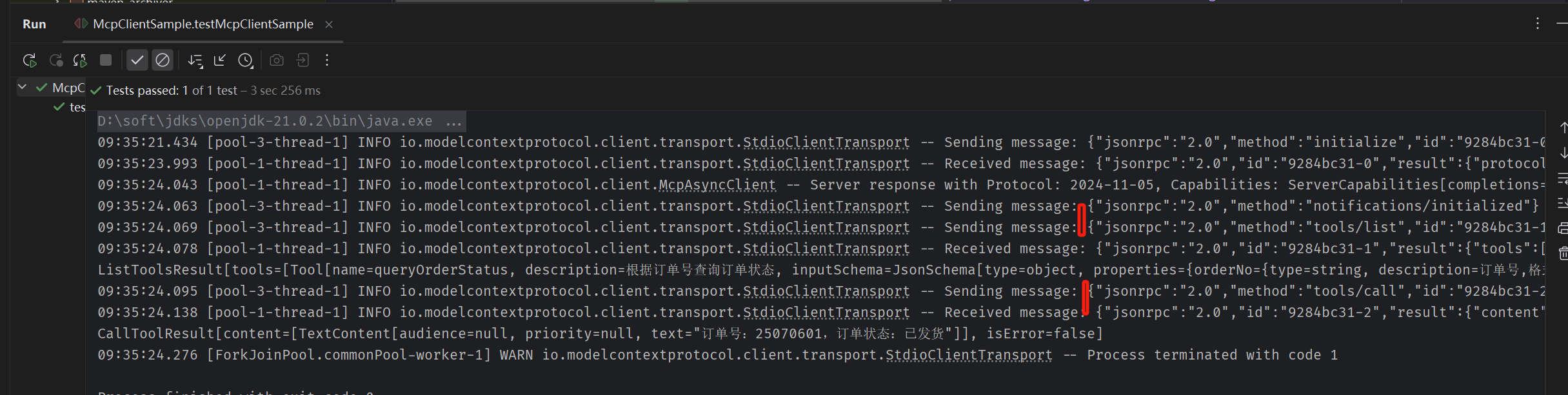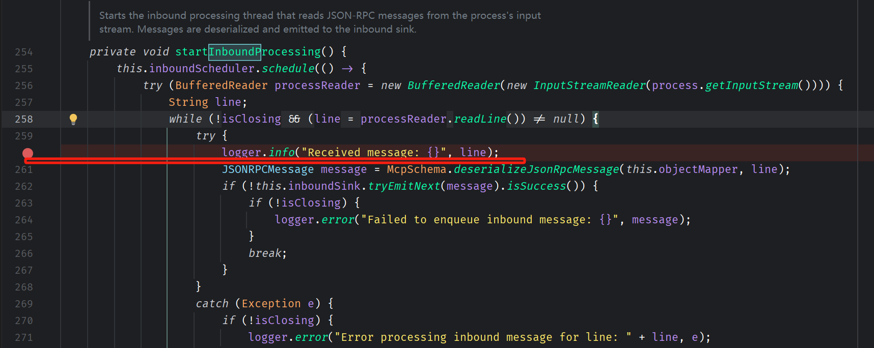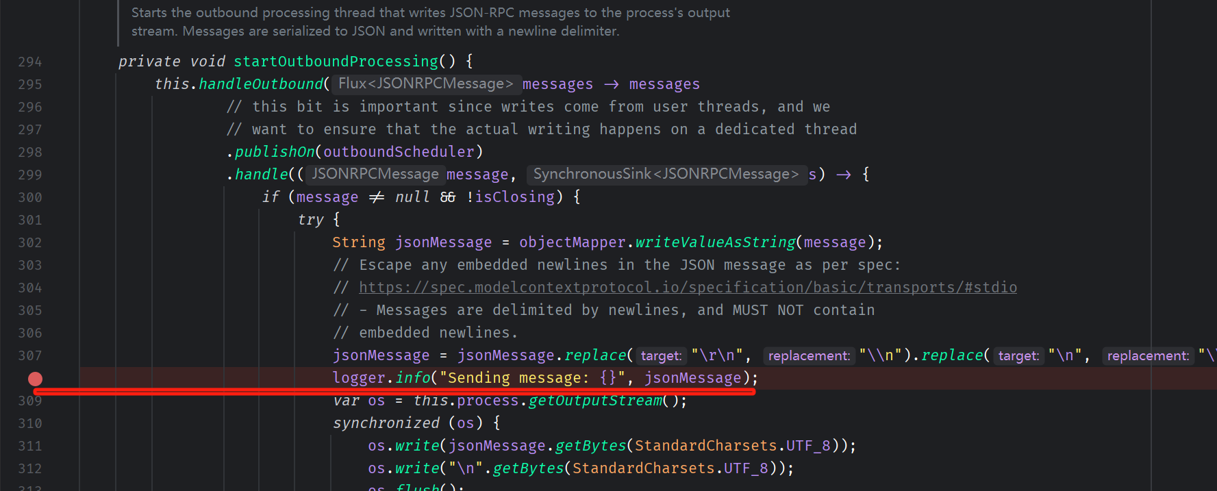 如果想知道交互过程中的json原文,可以下载 https://github.com/modelcontextprotocol/java-sdk 源码,找到io.modelcontextprotocol.client.transport.StdioClientTransport 这个类: