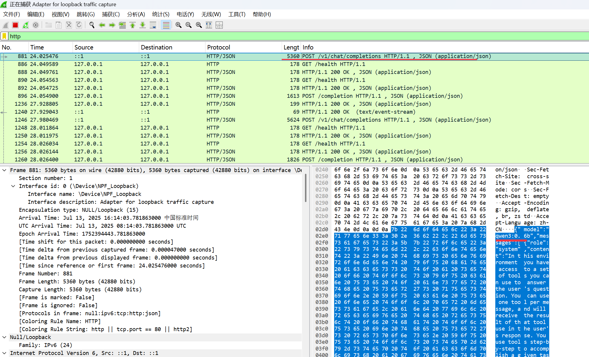 可以用wireshark之类的抓包工具,抓一个看看,考虑到OpenAI, DeepSeek官方API,这些通常都是https加密传输,抓包内容不容易阅读。我们以cherry studio +本地ollama(加载1个小点的模型qwen3:0.6b) 做为试验环境