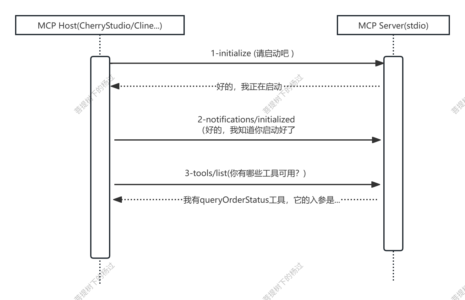 当MCP Server写好,在CherryStudio/Cline等MCP Host中添加MCP Server时,大致过程如下(注:仍以stdio模式分析, 不同的MCP Host内部实现细节可能有差异,但是下图不影响新手学习)