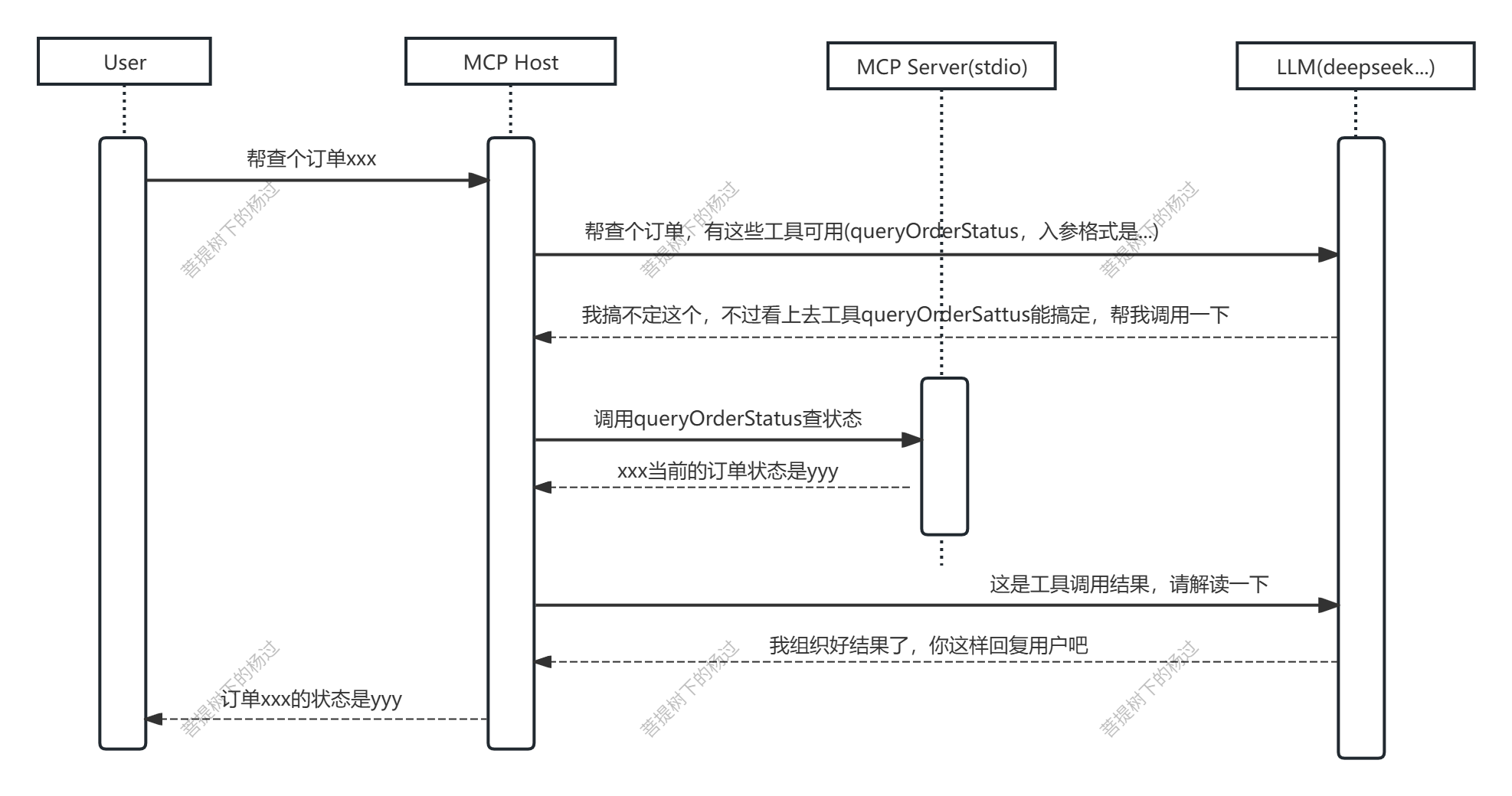 那么,问题来了:MCP Host向大模型(注:其实是大模型前面的API,比如:OpenAI,或deepseek API或本地ollama API) ,请求查询订单状态时,发出来的prompt到底长啥样?里面关于MCP 工具的描述是如何 写的?