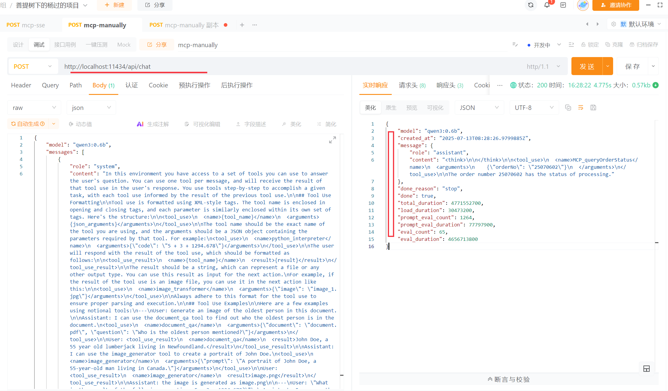 The order number 25070602 has the status of processing.说明大模型表明了意图:知道自己已有的知识搞不定这个,希望MCP Host来调用工具MCP_queryOrderStatus,感兴趣的同学可以按这个思路,继续看后续的抓包报文,就不一一分析了。理论上,参考cherry studio的这个思路,我们自己也可以重造轮子,写1个自己的MCP Host,本质上就是prompt工程。
