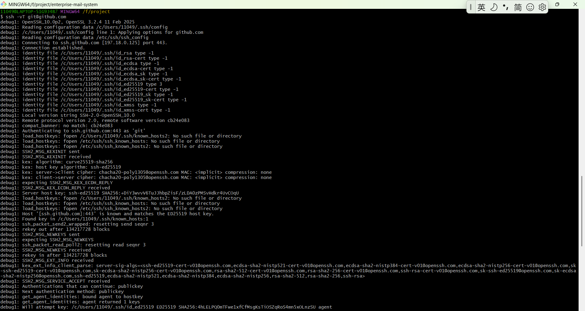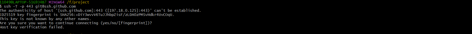 这表示第一次连接到 ssh.github.com:443,系统在询问你是否信任该主机的指纹。你刚才没有输入 yes,所以失败了。首次连接需要验证指纹,输入 yes 后成功建立连接。