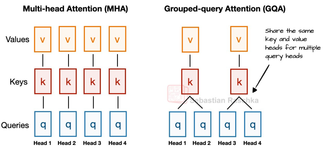 图 9:MHA 与 GQA 的比较。此处,分组大小为 2,其中键值对在 2 个查询之间共享。
