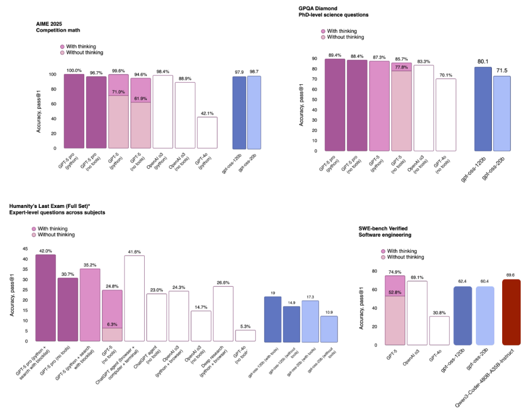 图 24:主要基准图表来自 GPT-5 官方公告。gpt-oss 数据取自官方模型卡和公告,Qwen3 数据取自官方 Qwen3-Coder 代码库。