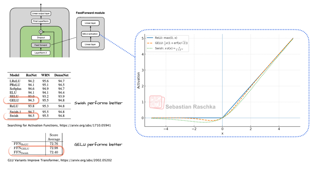 如今,Swish 已被应用于大多数架构。然而,GELU 并未被完全遗忘;例如,谷歌的 Gemma 模型仍然使用 GELU。