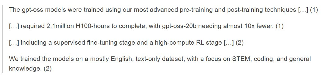 遗憾的是,关于 gpt-oss 的训练集大小和算法的信息并不多,但我从其模型卡 (1) 和宣布文章 (2) 中找到了一些有趣的拼图碎片: