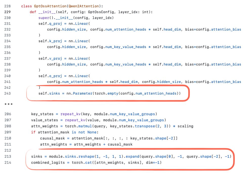 你可能注意到的另一个细节是图 18 代码截图中 sinks(sinks)的定义。在一般模型中,注意力 sinks 是放置在序列开头的特殊「始终关注」token,用于稳定注意力,这在长上下文场景中尤其有用。也就是说,如果上下文变得很长,开头这个特殊的、被关注的 token 仍然会被关注,并且它可以学习存储一些关于整个序列的普遍有用的信息。