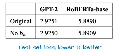 自 GPT-2 时代以来,我就没见过这些偏差单元被使用,它们通常被认为是多余的。事实上,我发现了一篇最近的论文,从数学上证明了至少对于键变换 (k_proj) 来说,情况确实如此。此外,实证结果表明,使用和不使用偏差单元之间几乎没有差异(见下图 19)。