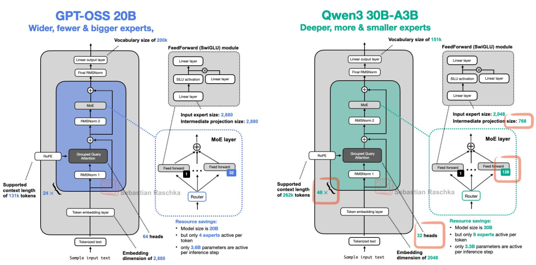 可以看到,gpt-oss 20B 和 Qwen3 30B-A3B 在架构组件上非常相似。除了尺寸之外,主要区别在于 gpt-oss 采用了滑动窗口注意力,而 Qwen3 则没有。