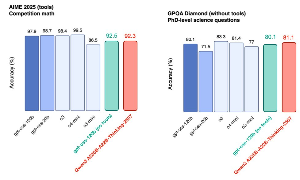 然而,需要注意的是,gpt-oss-120b 的大小几乎只有 Qwen3 A235B-A22B-Thinking-2507 模型的一半,而且可以在单台 GPU 上运行。