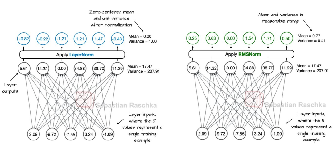 LayerNorm 和 RMNSorm 都能稳定激活尺度并改善优化效果,但 RMNSorm 通常更适合大规模 LLM,因为它的计算成本更低。与 LayerNorm 不同,RMNSorm 没有偏差(平移)项,并将昂贵的均值和方差计算简化为一次均方根运算。这将跨特征约简的次数从两次减少到一次,从而降低 GPU 的通信开销并提高训练效率。