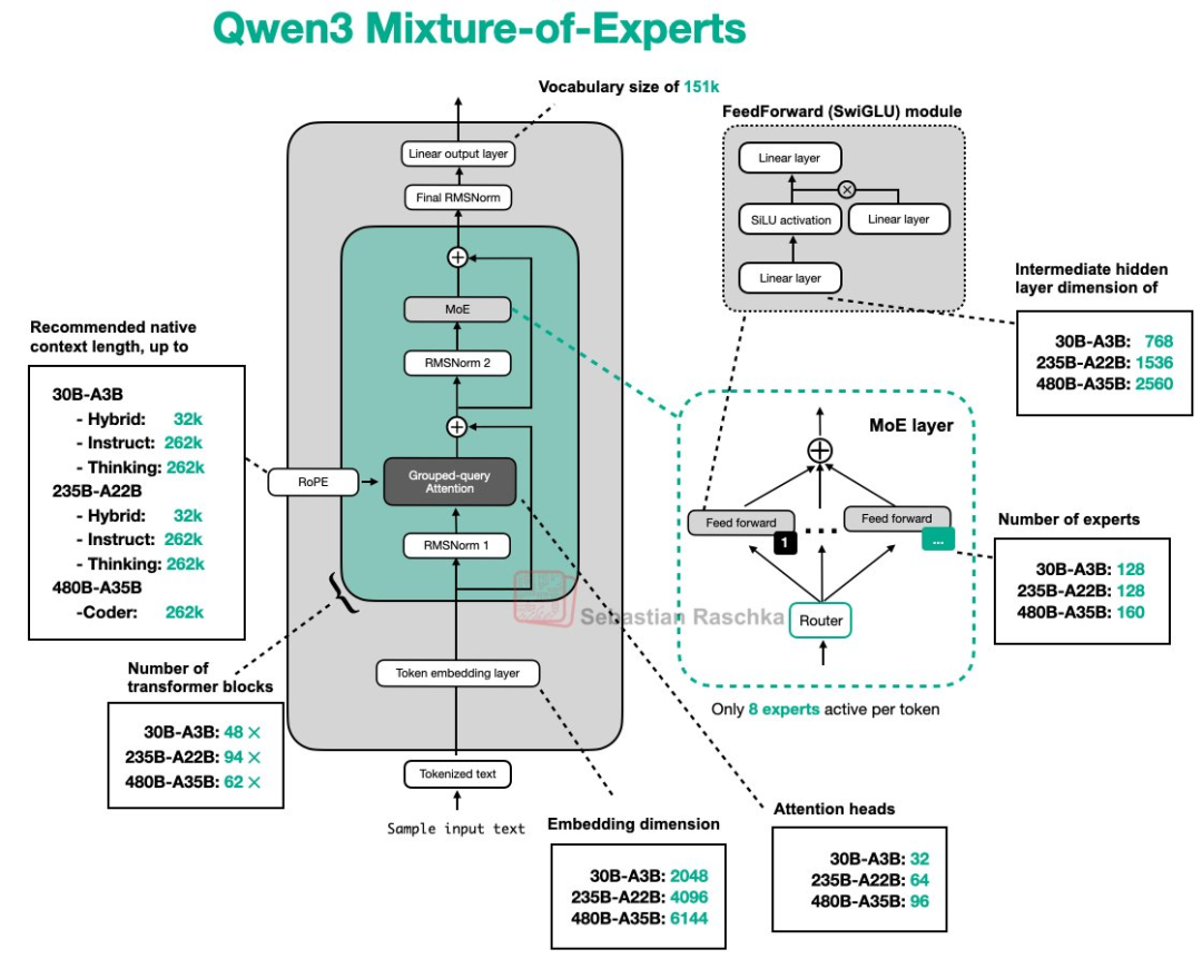我之所以选择 Qwen3,是因为截至撰写本文时,它是顶级的开放权重模型之一。此外,Qwen3 也是 MoE 模型,由于其可训练参数的总体规模相对相似,几乎可以直接与 gpt-oss 相比。