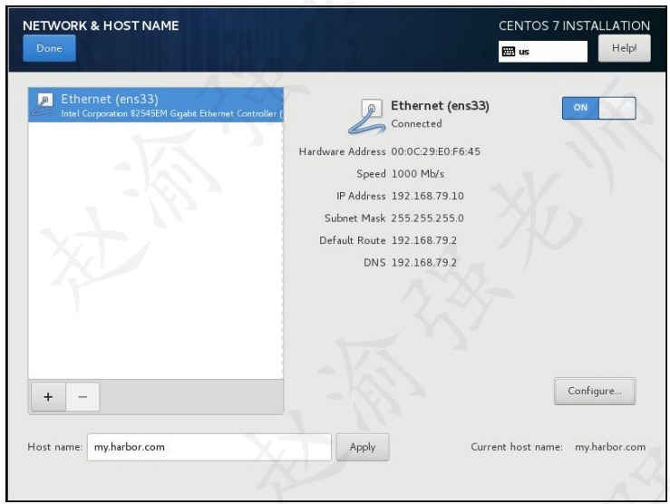 为了更好地演示Harbor的安装和部署的过程,这里单独准备一台虚拟机作为运行Harbor的主机。下图展示了Harbor主机的网络配置和主机名信息。