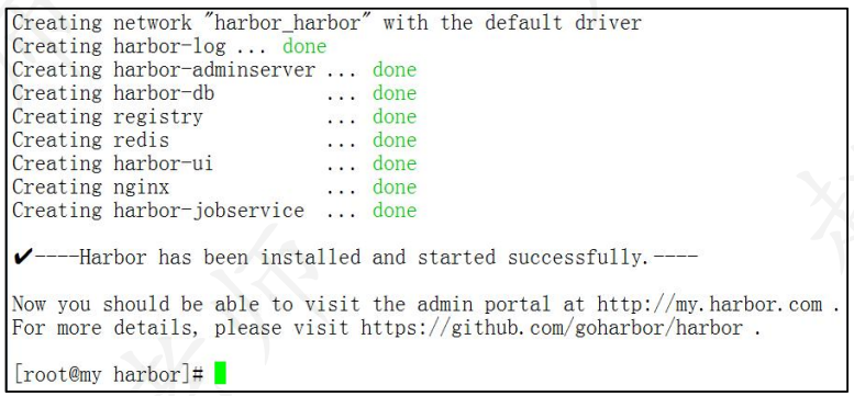 (5)执行install命令安装Harbor。下图展示了安装完成后的界面。