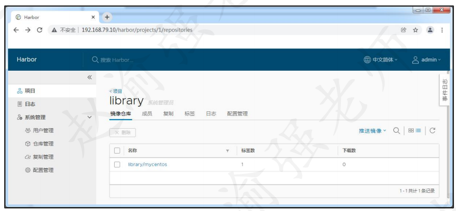 (10)在Harbor的Web主页上确定上传的镜像信息。可以看到成功将生成的mycentos镜像保存到了私有的镜像仓库中,如下图所示。