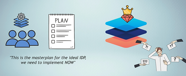 你不应该采取的方法是,一开始就构思一个庞大的主概念,以及一个理想中的IDP(身份管理平台)或自助服务平台,这个平台集成了所有最酷的功能和现代技术栈,非常灵活且强大,能够做上千件事情。