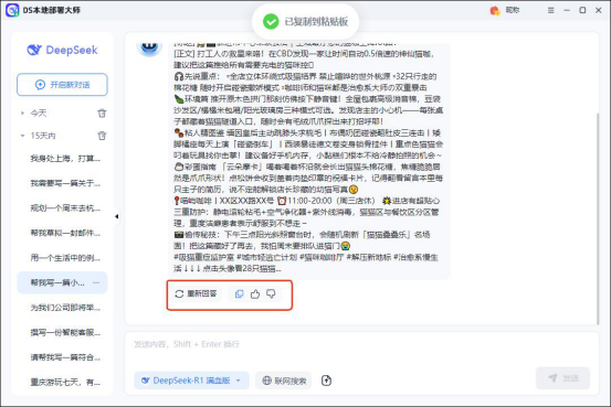 ⑤生成完成后,用户可以在界面上查看结果,若对结果满意,可点击 “复制” 按钮将文本复制到其他地方使用;若需要调整,可修改输入内容后再次点击 “生成”。