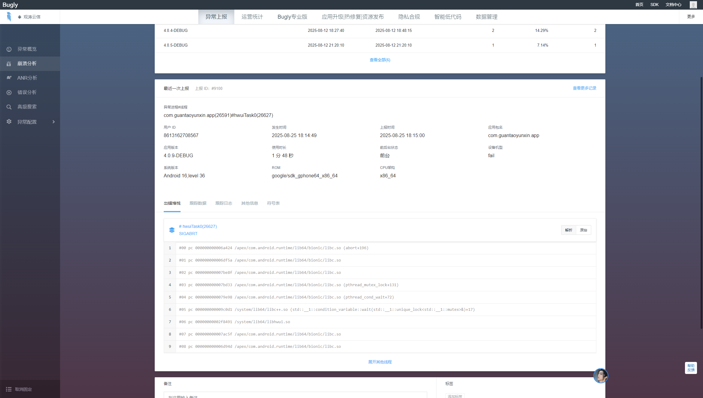 遇到的 SIGABRT 错误是 Android 开发中一个比较常见但也很棘手的崩溃类型。abort+160 表明是系统主动终止应用。