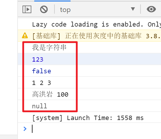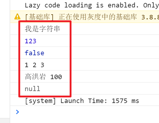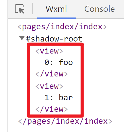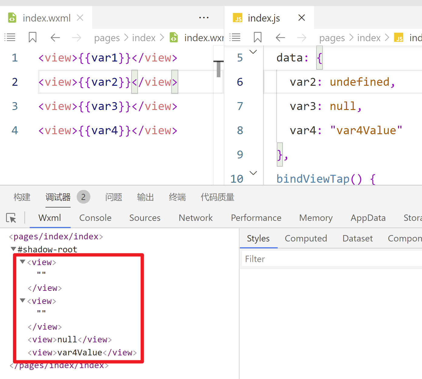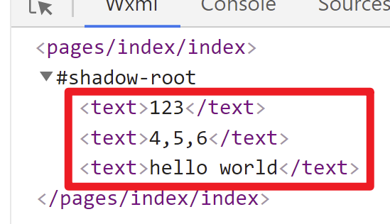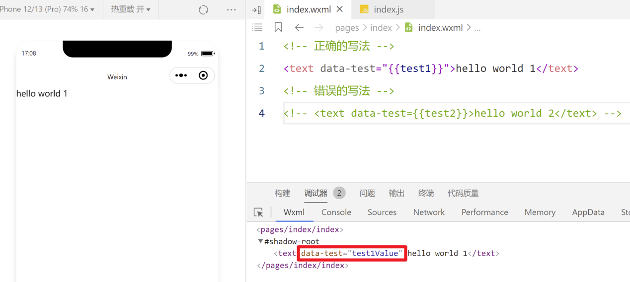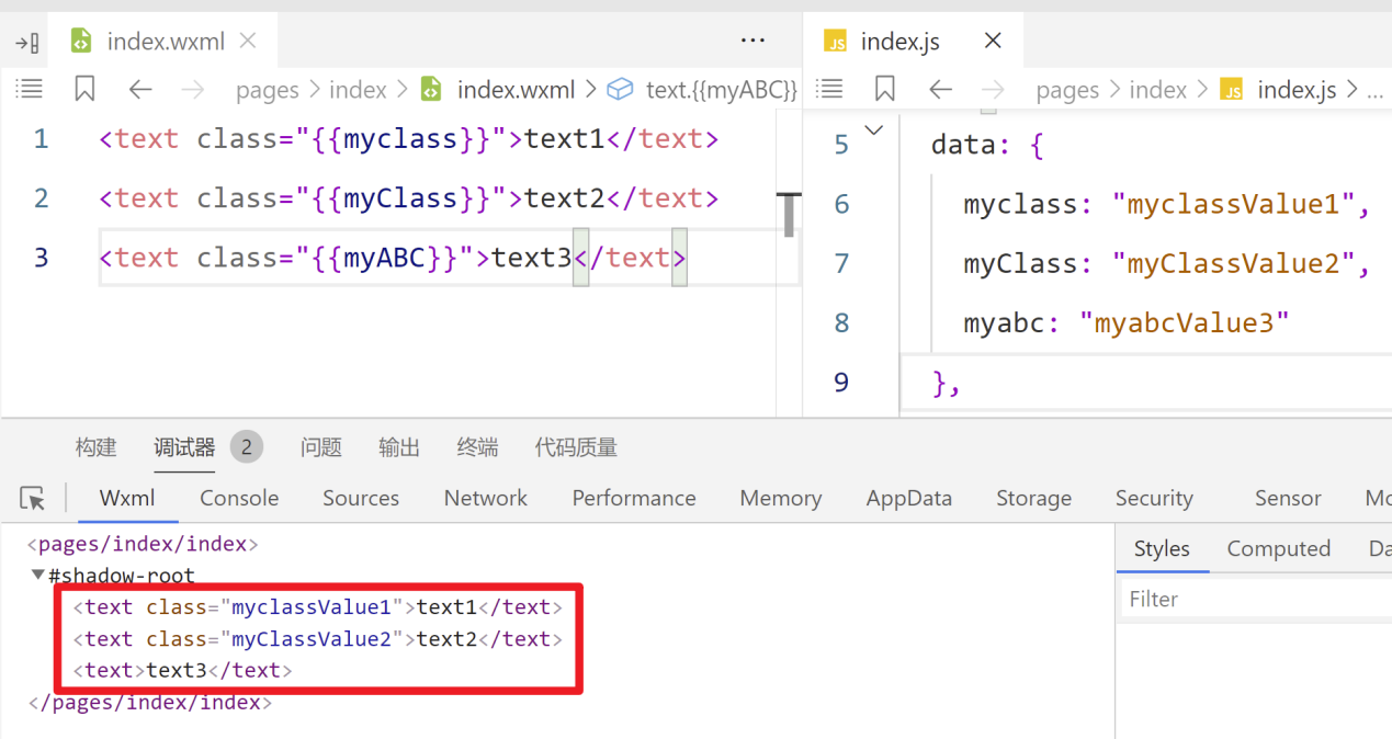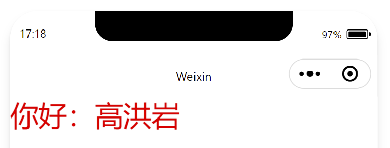 使用<text>标签显示文字,添加了类样式的class属性。最为关键的是使用{{}}格式显示username属性的值"高洪岩"。