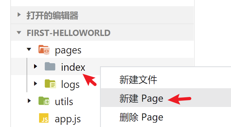 在index文件夹点击鼠标右键选中“新建Page”菜单,如图2-xx所示。