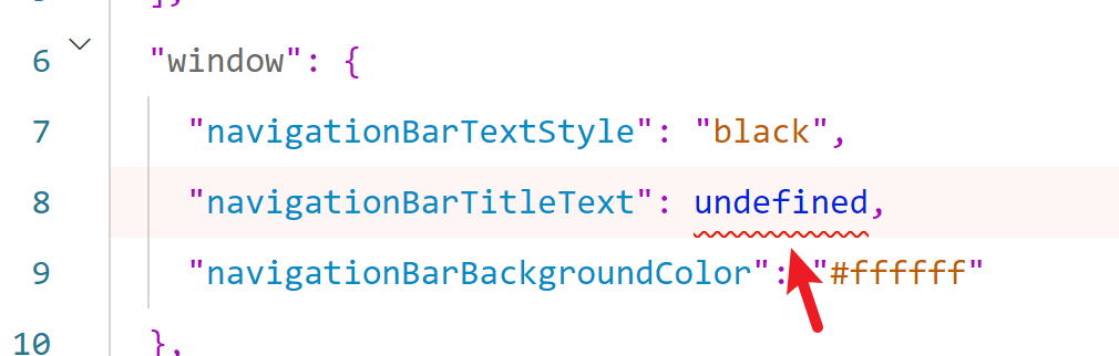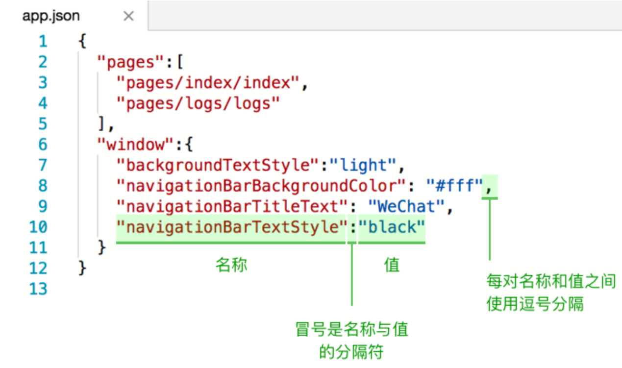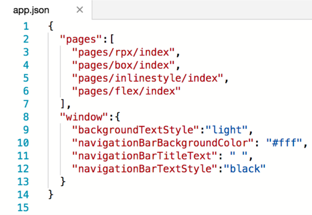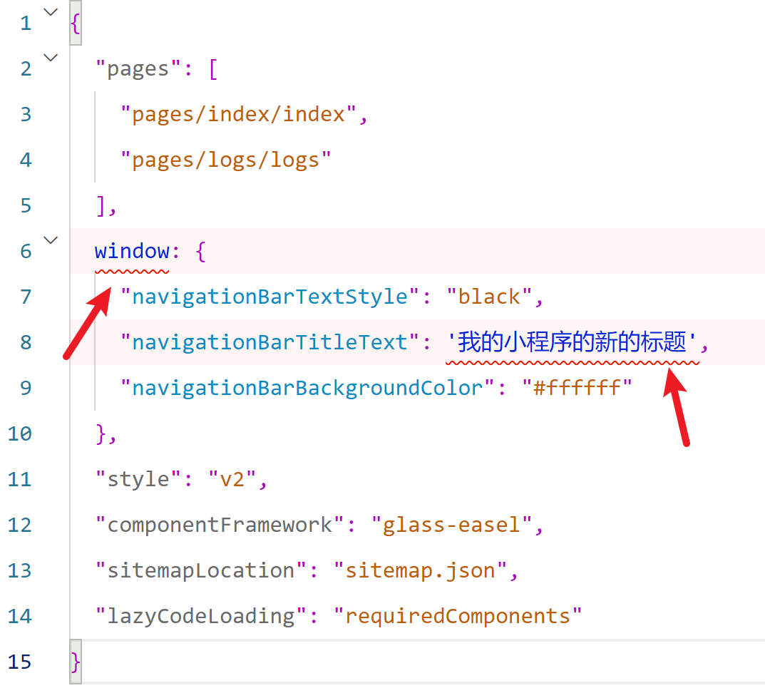 创建名称为changeNavigationBarTitleText的小程序项目并找到app.json文件,静态配置代码如下: