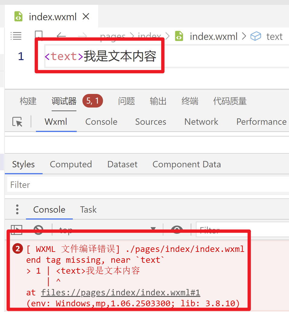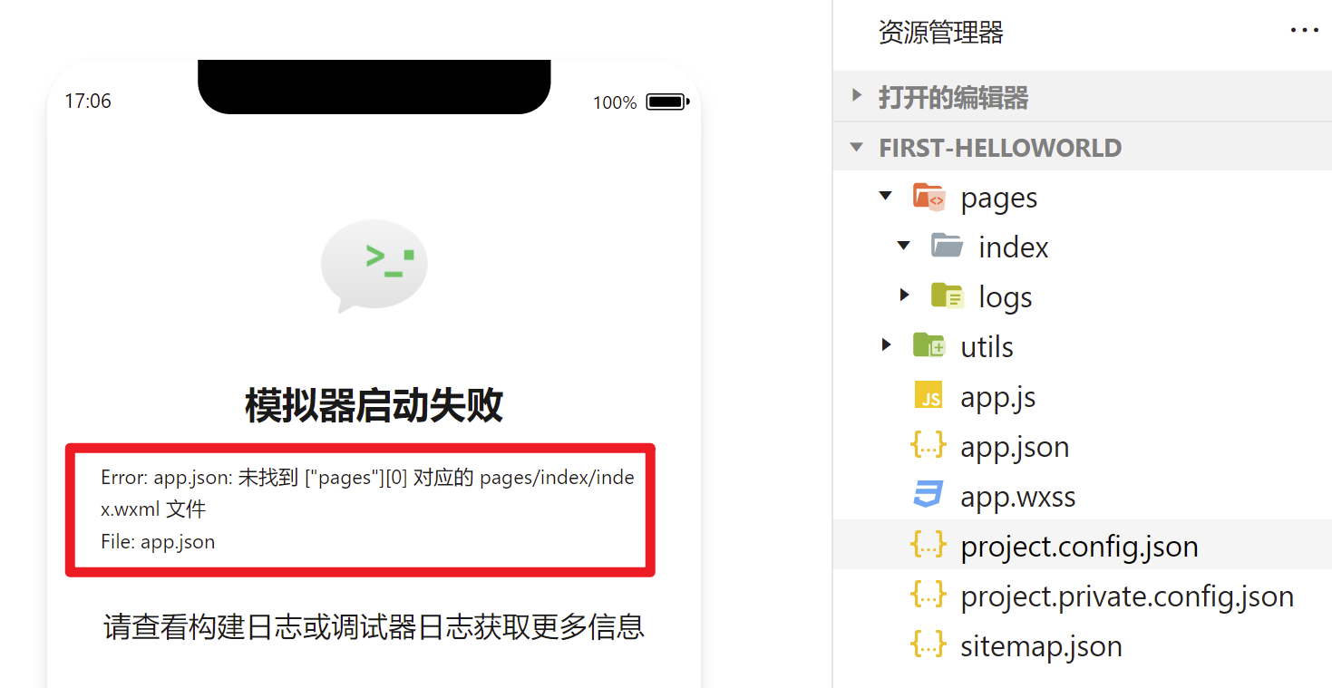 由于没有WXML文件,模拟器出现异常,如图2-xx所示。