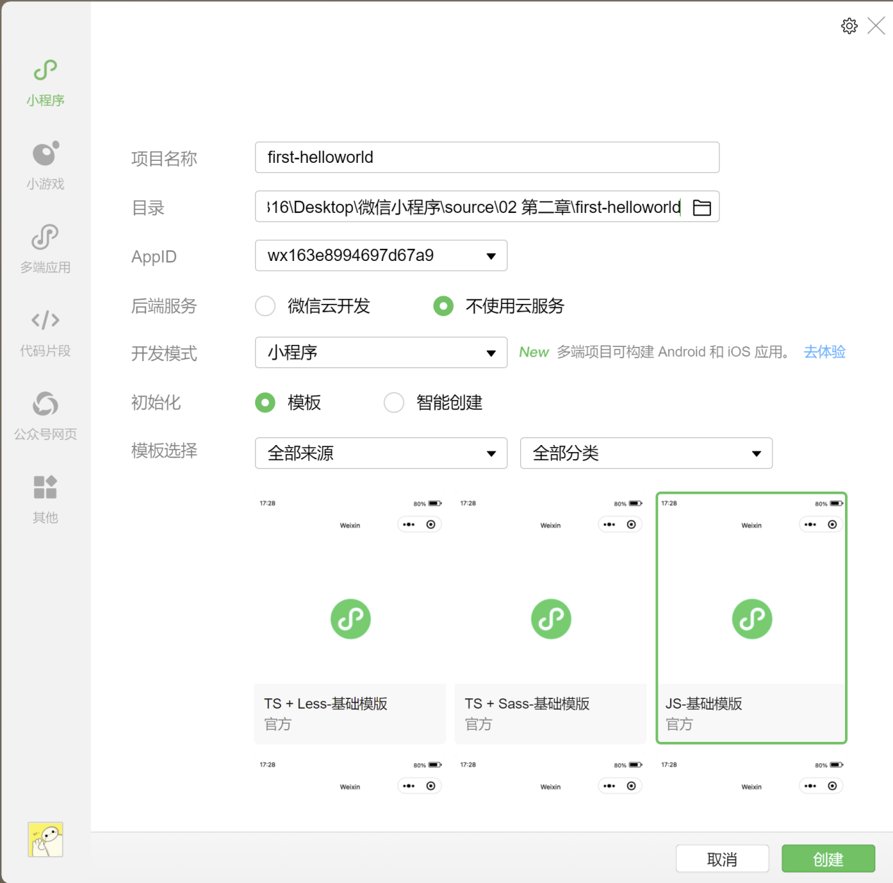 在开发者工具中创建类型为“小程序”的项目,如图2-xx所示。