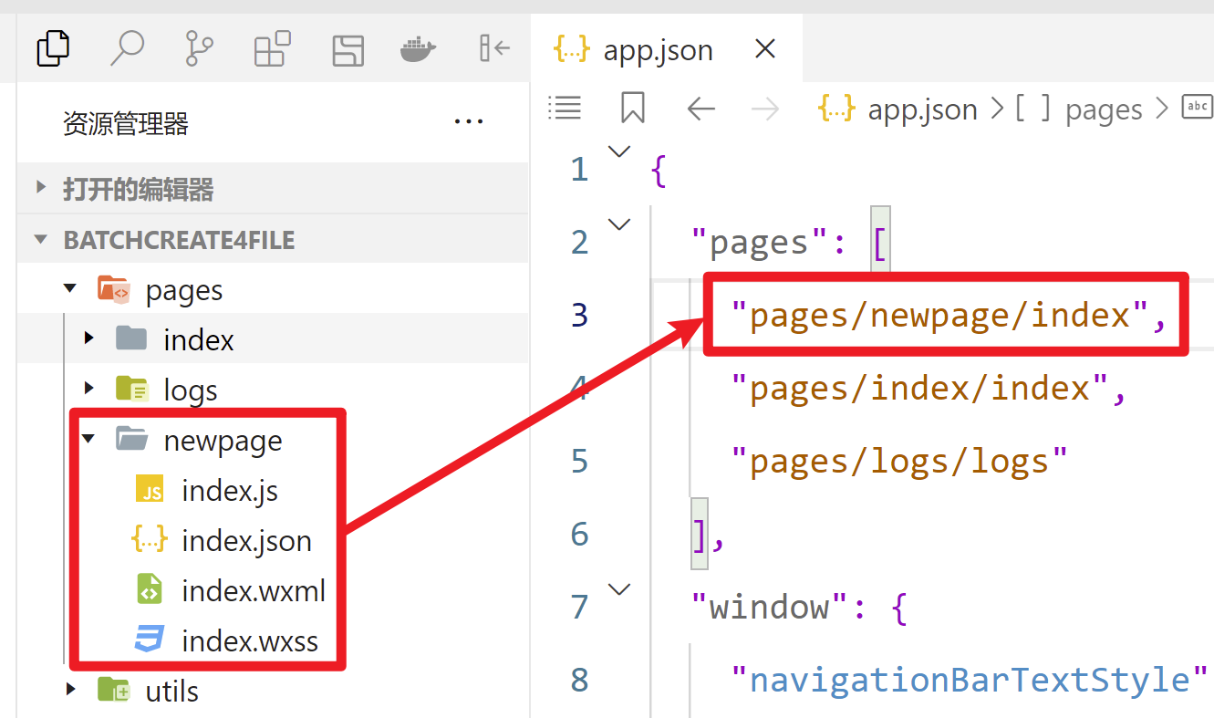 保存app.json文件后可以在编辑器中看到自动创建的4种文件类型,如图2-xx所示。