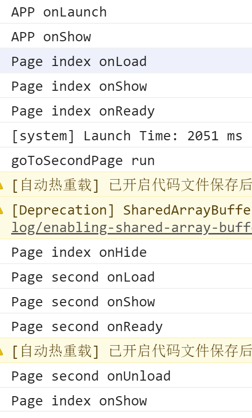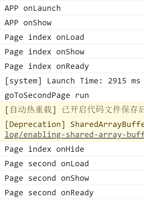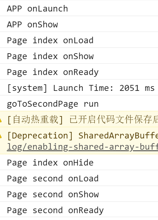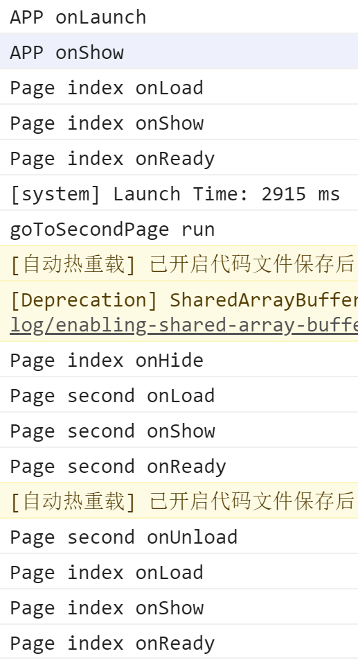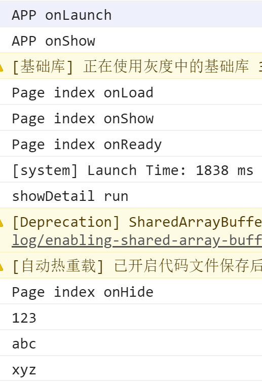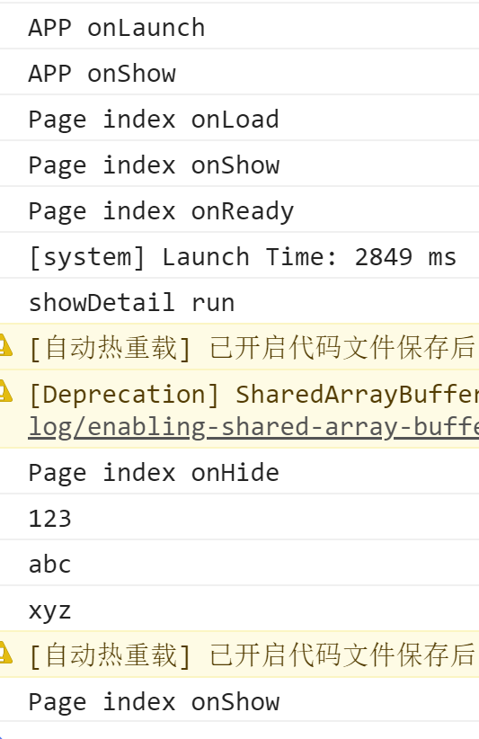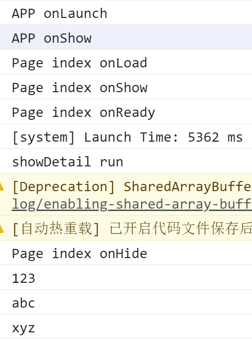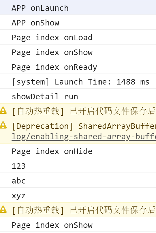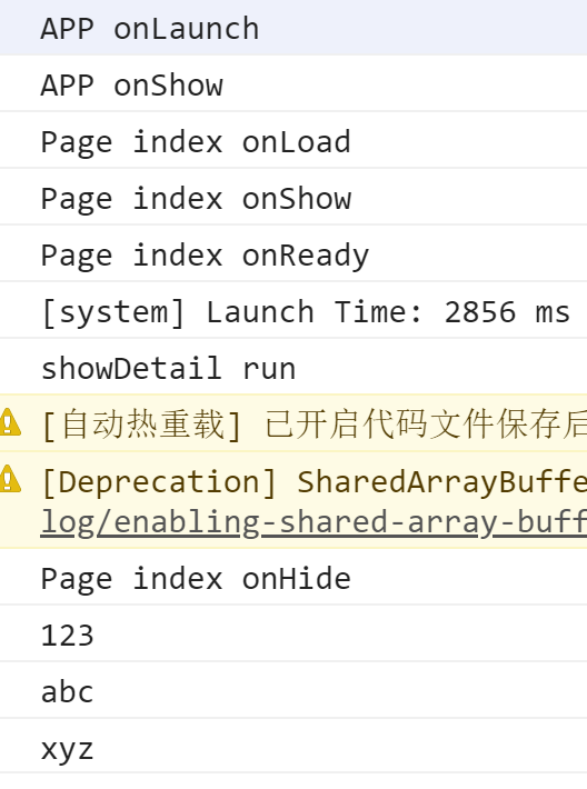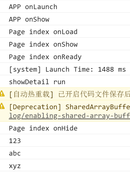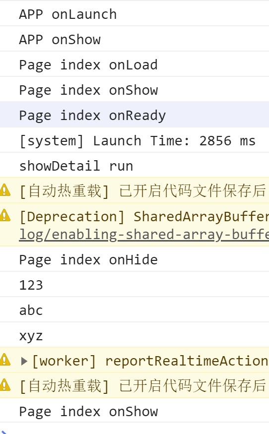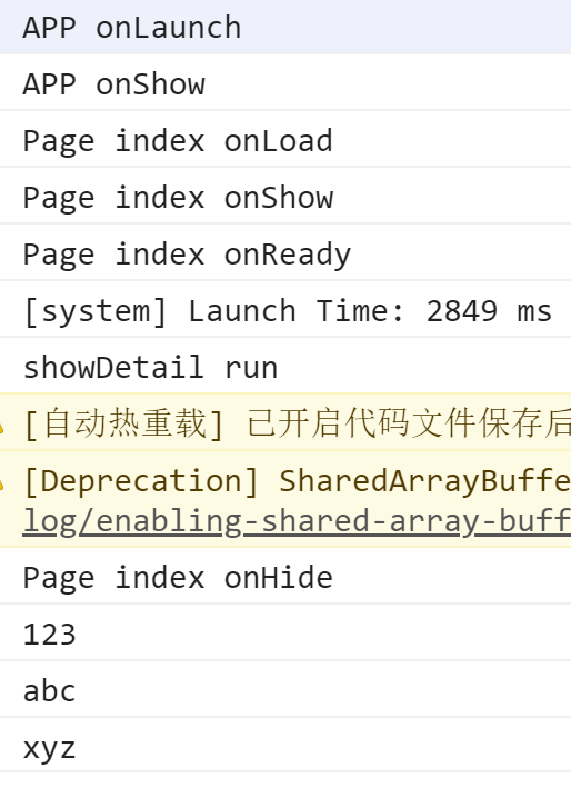 点击界面上的任何一个条目返回小程序的index界面,控制台打印效果如图2-xx所示。