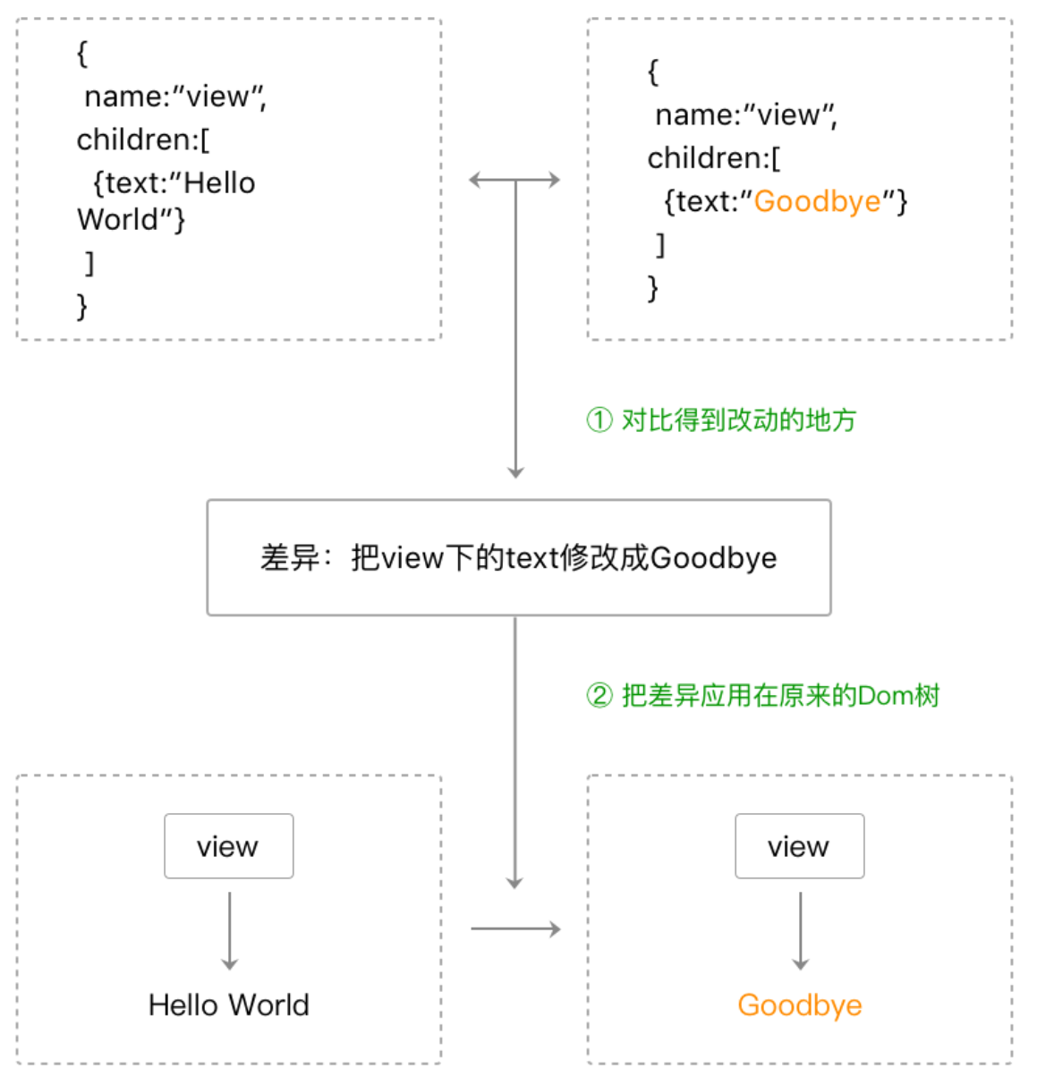 通过setData()方法把msg数据从“Hello World”更新成“Goodbye”,产生的JS对象对应的节点就会发生变化,此时可以对比前后两个JS对象得到变化的部分,然后把这个差异应用到原来的Dom树上,从而达到更新UI的目的,这就是“数据驱动”的原理,如图2-xx所示。