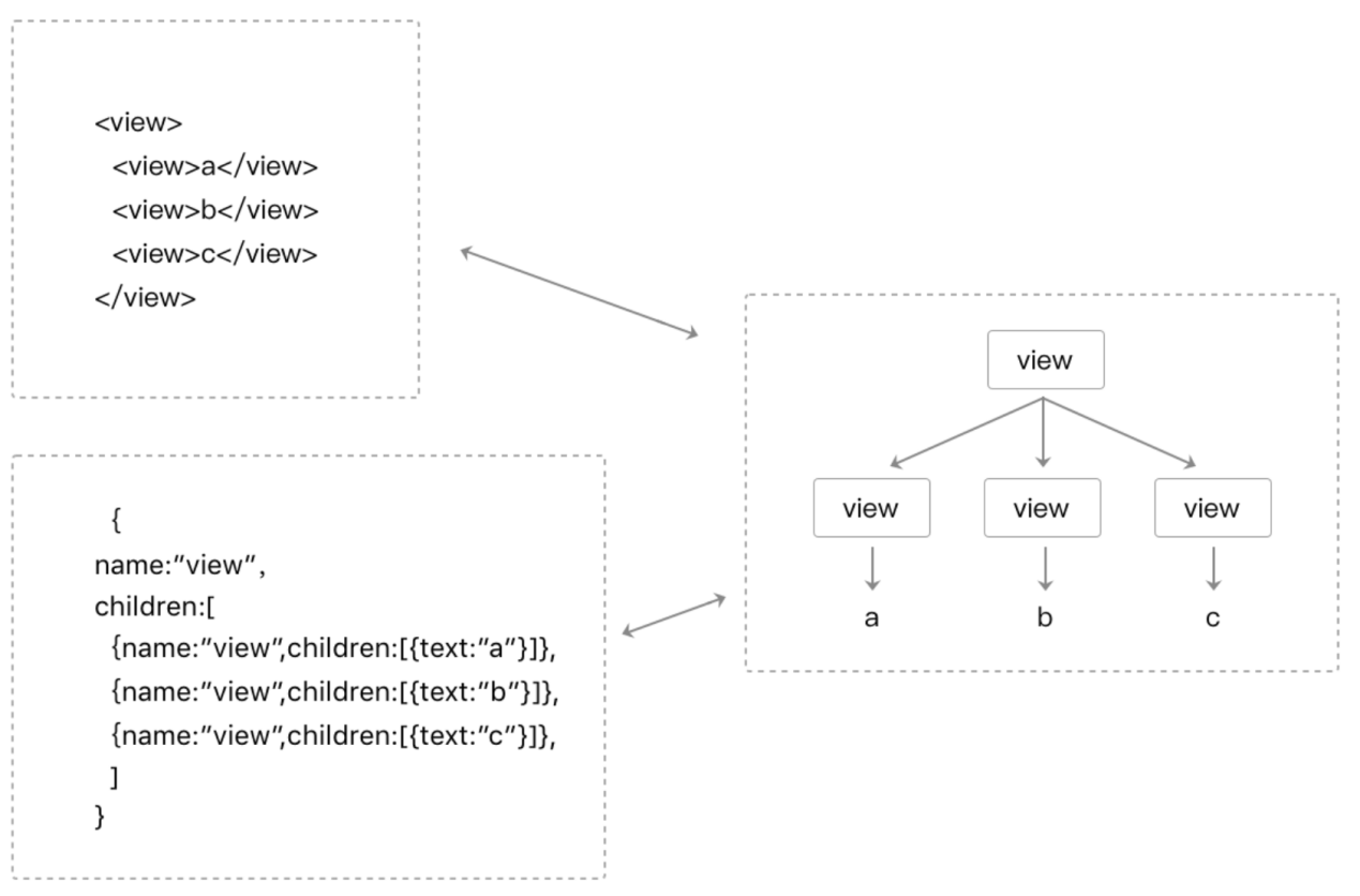 图2-xx WXML结构和JS对象均可以表示一棵Dom树