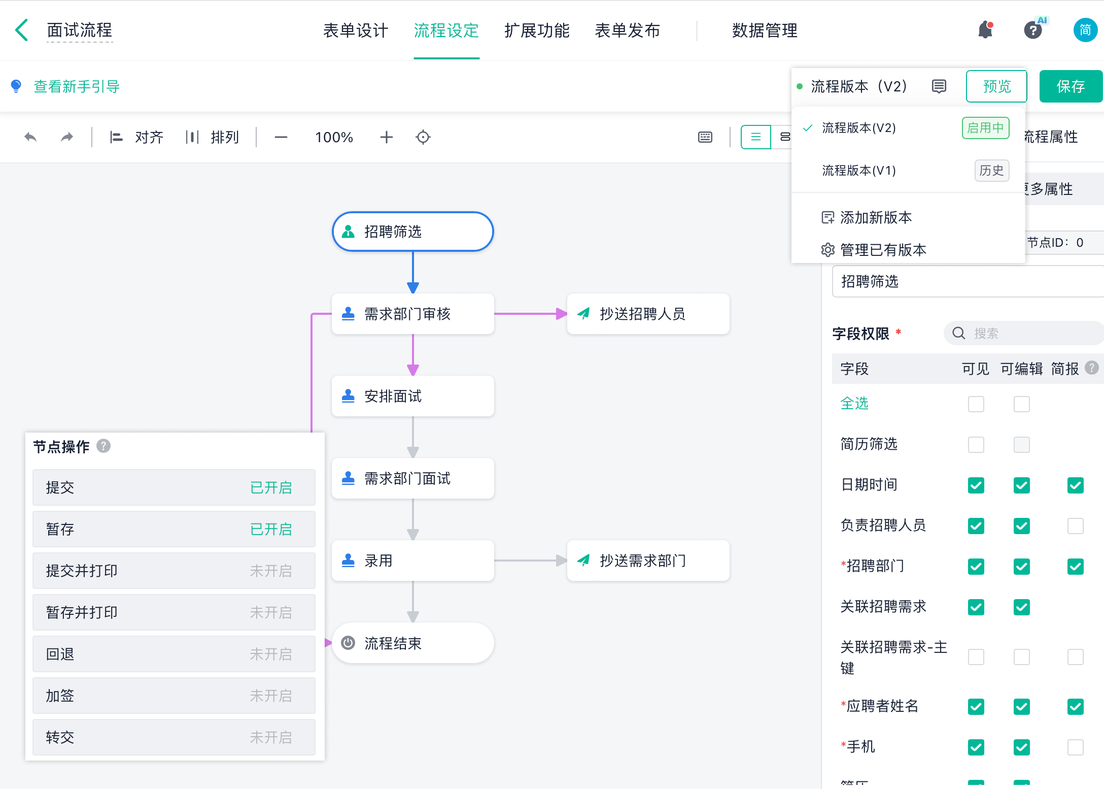 人力资源管理 :员工信息登记、绩效考核表、离职申请表。客户服务 :客户反馈表、产品试用申请、售后服务工单。市场调研 :问卷调查、用户满意度评分、产品需求收集。2. 流程:自动化审批和业务流转 功能描述 : 流程引擎支持自定义审批规则,包括多级审批、并行审批、条件跳转等。用户可以通过可视化界面设置流程路径,无需编写代码。例如: