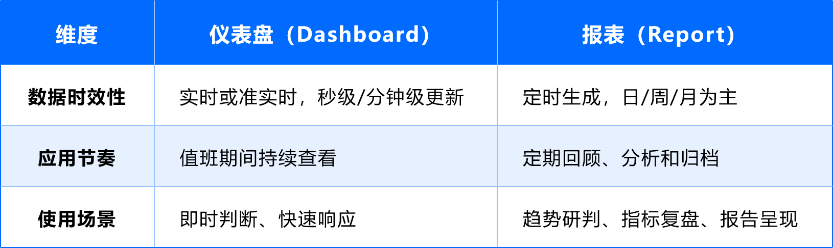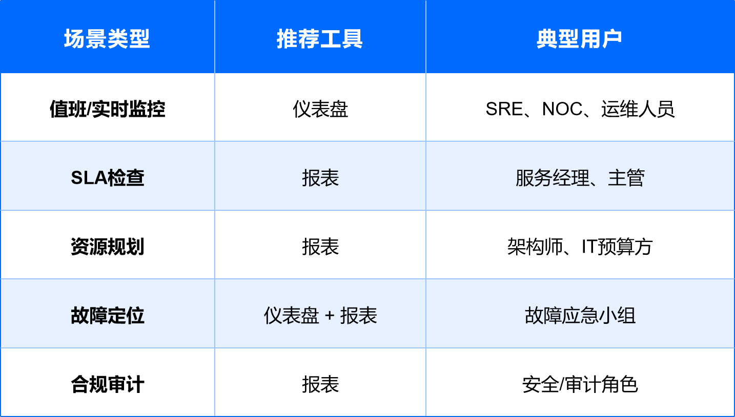 仪表盘强调“现在”,侧重在运行态中帮助用户识别异常、掌握系统当前状况。而报表关注的是“过去一段时间的全貌”,目的是提供系统性回顾与决策依据,如容量趋势、SLA达成率等。