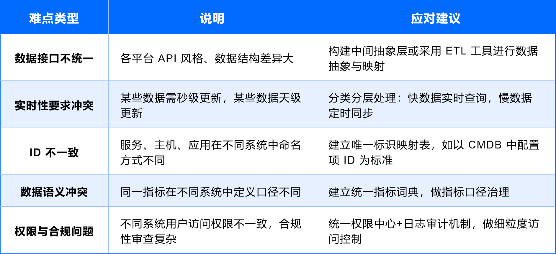 监控报表通常需要整合来自多个系统的数据源(见4.1 多数据源融合与指标定义),如 APM、日志平台、CMDB、工单系统等。跨系统集成过程中常见如下难点: